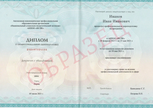 Учащиеся получают второй диплом без доплат. После окончания программы среднего профессионального образованя они проходят профпереподготовку по программе на выбор, например: тьюторпедагог-организаторвоспитатель детей дошкольного возраста, учитель технологииспециалист по кадровому делопроизводству, учитель физической культуры, специалист по закупкам