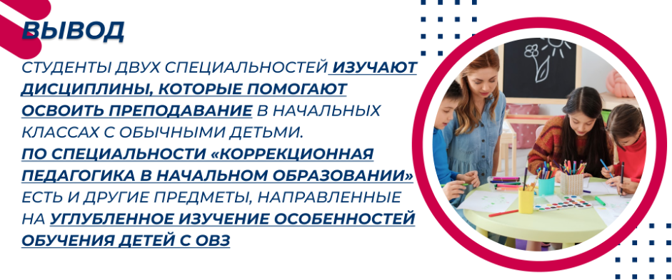 У студентов специальностей «Преподавание в начальных классах» и «Коррекционная педагогика в начальном образовании» есть общие профильные дисциплины: | Профильные предметы, которые есть только по специальности «Коррекционная педагогика в начальном образовании»: |