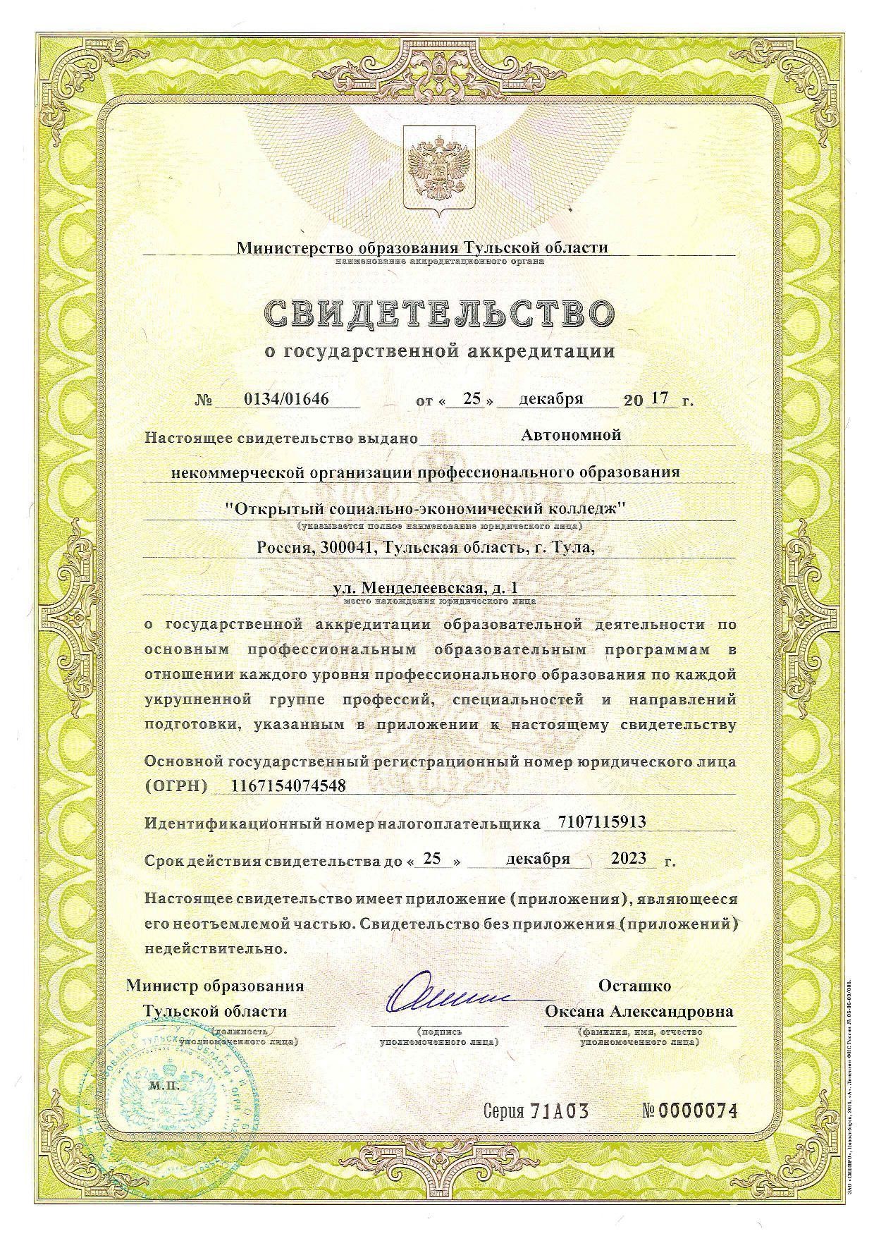 • Бессрочной государственной лицензии на осуществление образовательной деятельности.