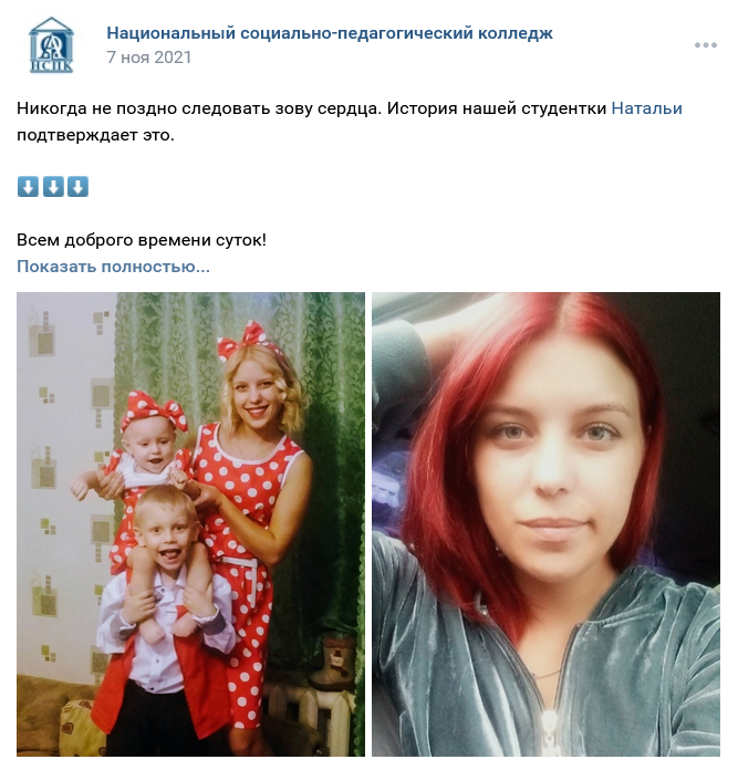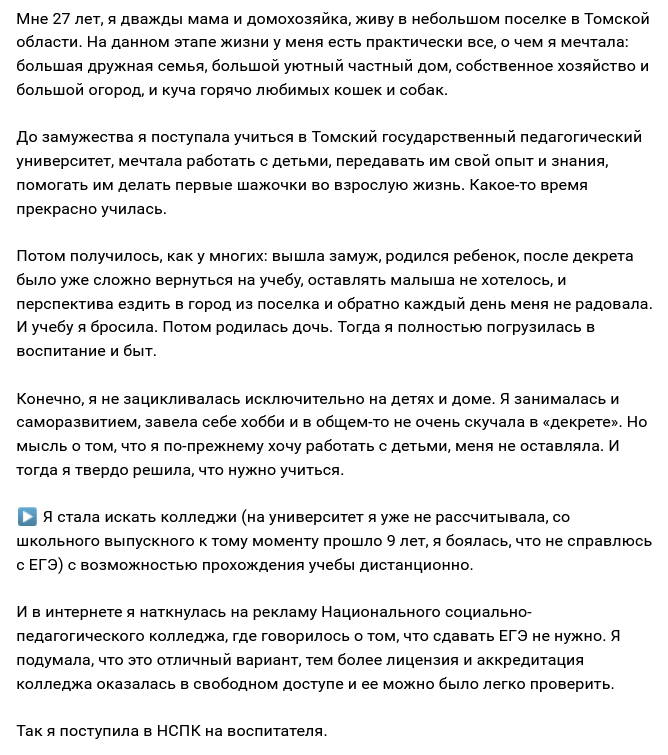 “ Студентка НСПК Наталья окончила школу почти 10 лет назад. В университете она не доучилась — вышла замуж, родила сына и поняла, что не сможет совмещать учебу и семью. Поступление в НСПК позволило Наталье воплотить давнюю мечту в реальность — получить образование воспитателя без отрыва от семьи и дома.